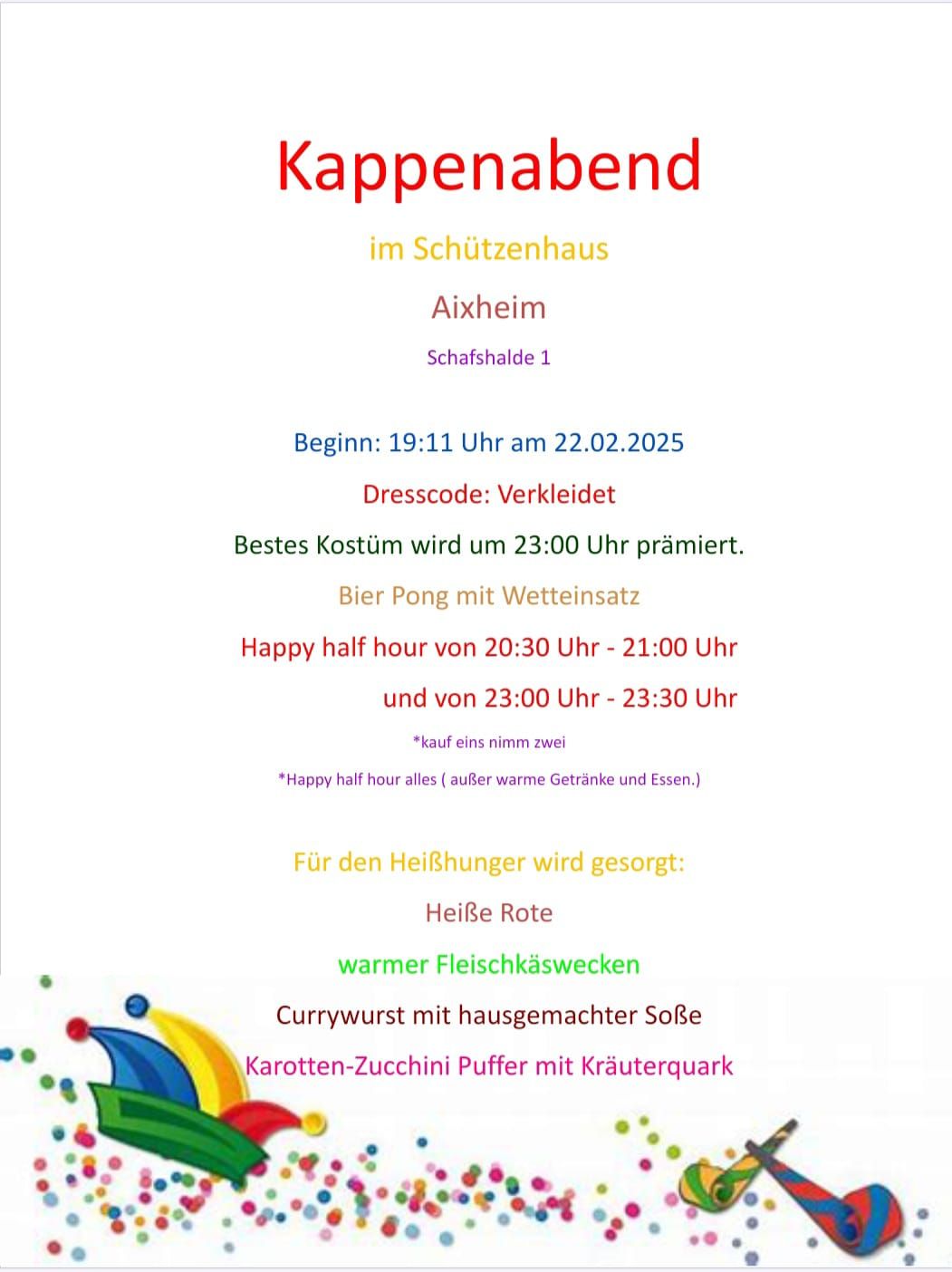 Der Schützenverein lädt am Sonntag, 26. Oktober 2025 in die Aixheimer Festhalle ein. Beginn 11.00 Uhr